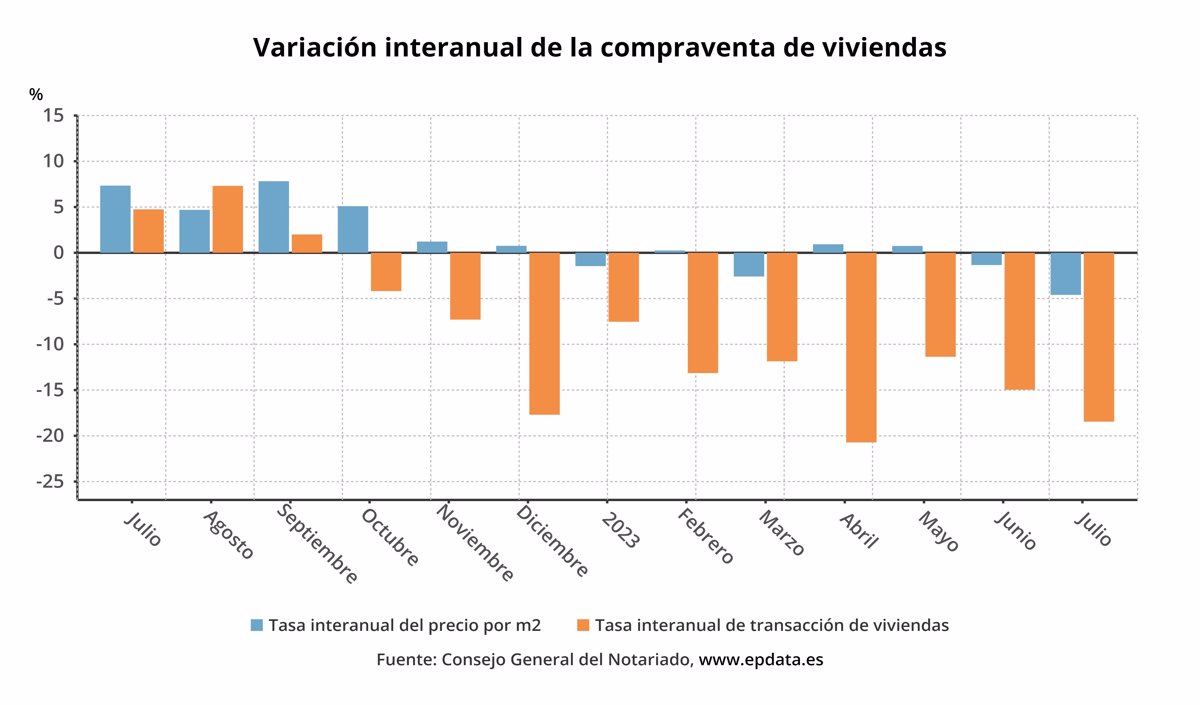 La vente et l’achat de logements en Espagne ont baissé de 18,4% en juillet dernier par rapport au même mois de l’année précédente, et l’octroi de prêts hypothécaires pour l’acquisition de ces biens a chuté de 25,7%, selon les données publiées jeudi par le Conseil général des notaires.